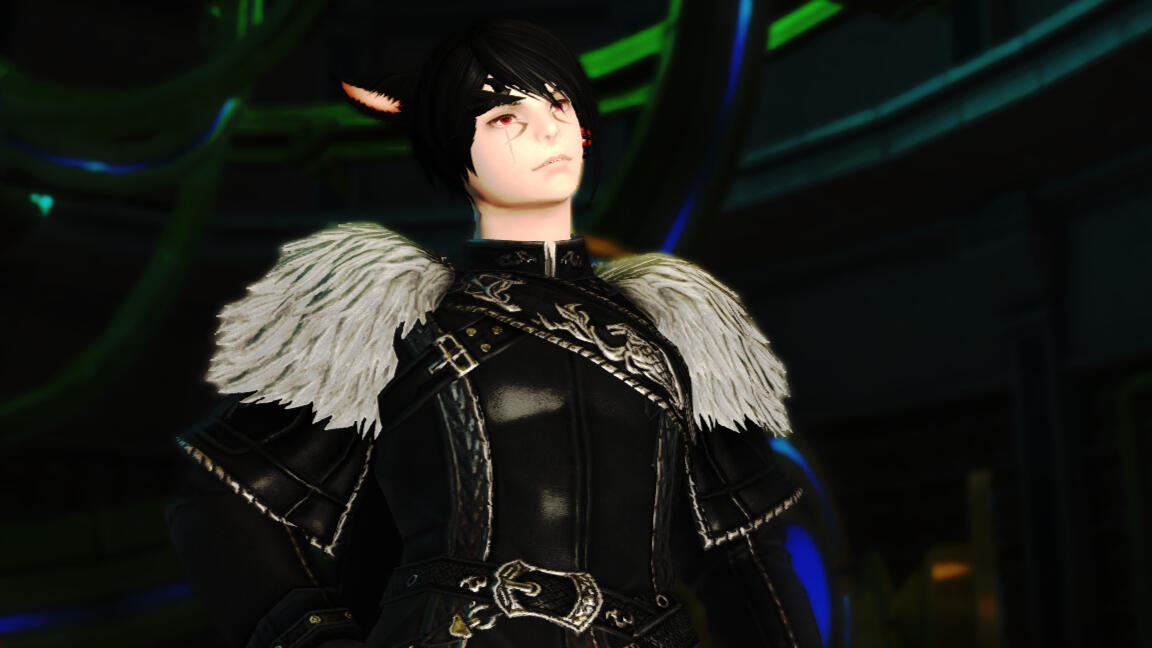 Black hair, befitting of his given name.Dark red eyes, the mark of Allagan royalty.Usually wears dark clothing of Allagan or magitek design.Usually wears glasses in more casual settings and goggles or masks in combat settings.Usually can be seen with a neutral expression.